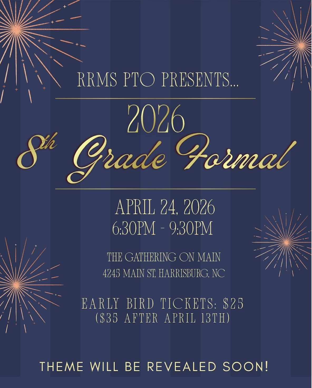 The RRMS 8th grade formal will be held on April 24, 2026 from 6:30-9:30pm at The Gathering on Main (4245 Main St, Harrisburg). Early Bird tickets are $25 per person through April 13th, then will ra...