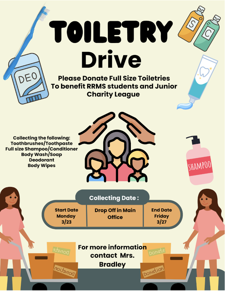 The Student Council is holding a Toiletry Drive 3/23-3/27 that will benefit students at RRMS and the Junior Charity League, a local organization that serves many of our students each year with basi...