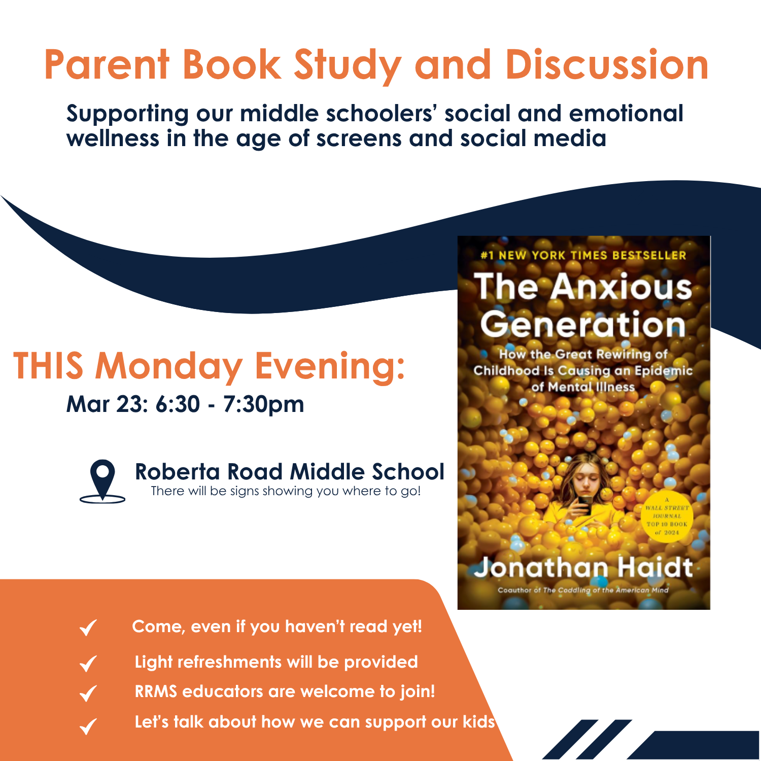 Please join us this Monday, March 23rd at the Roberta Road media center for our third meeting of the "Anxious Generation" parent book study! We will be discussing the information from chapters 5 th...