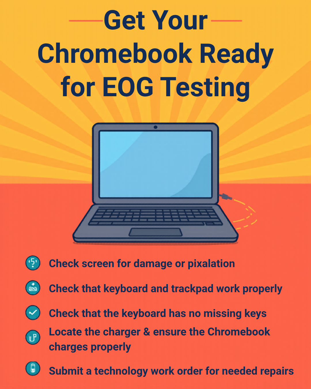 It’s the time of year to get Chromebooks in shape for EOG testing and end-of-year collection. Help your student(s) prepare for May by examining their Chromebook and charger using the checklist belo...