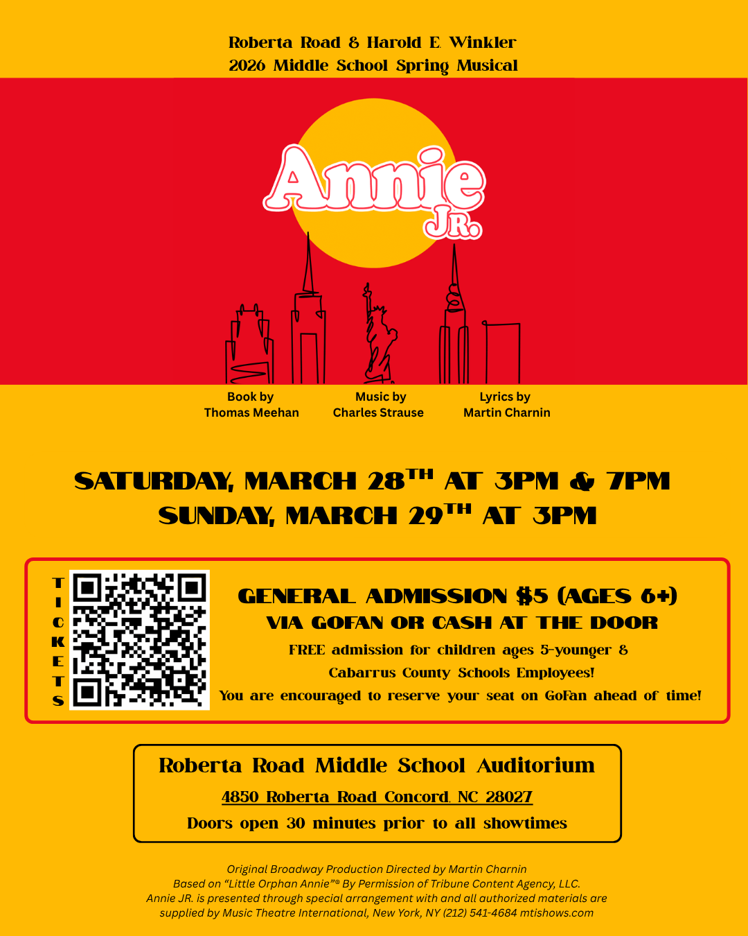 Annie Jr. Musical Roberta Road Middle and Harold E Winkler Middle Students3 Performances at the RRMS Auditorium:Saturday March 28th, 3:00pm & 7:00pmSunday, March 29th, 3:00pmDoors open 30 minut...